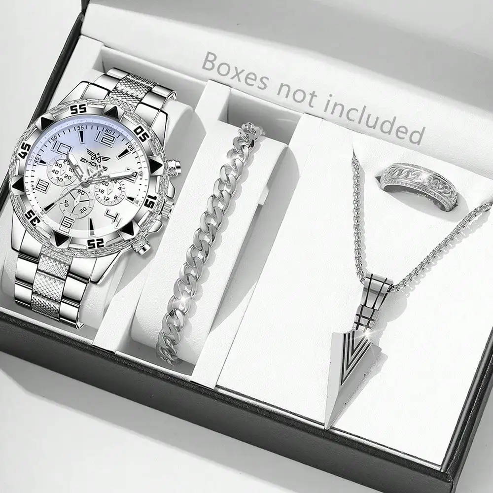 4PCS Argent Hommes Mode Casual Échelle Mixte Cadran Quartz